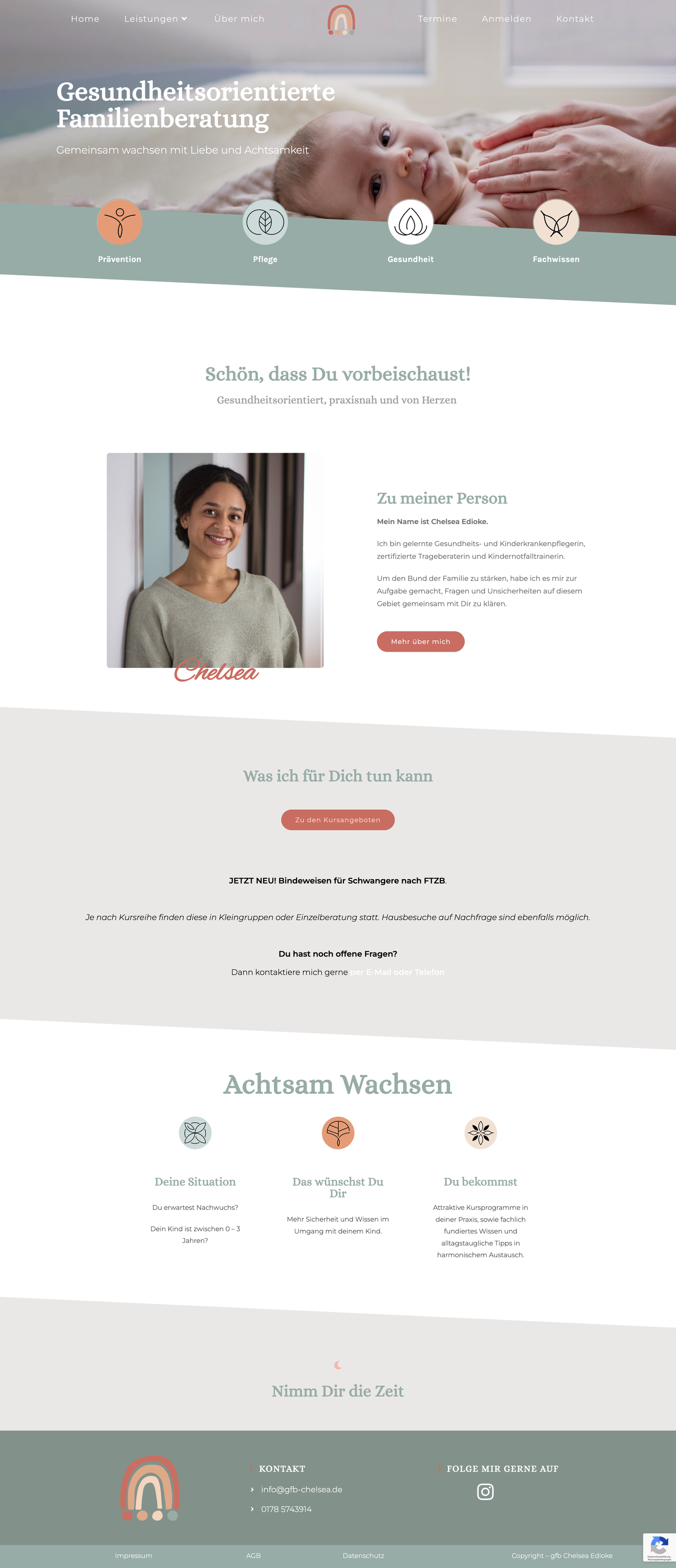 Erstellung einer Website für eine selbstständige Kinder-Krankenpflegerin, spezialisiert auf Angebote wie Säuglingspflege, Kindernotfalltraining und familienorientierte Gesundheitsberatung. Der Fokus lag auf einem vertrauensvollen und informativen Design, das die Dienstleistungen klar strukturiert und potenzielle Kund*innen gezielt anspricht.